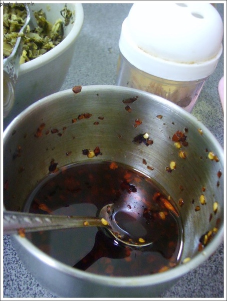 桌上應有的調味料都具備:酸菜、醋跟很辣的辣油。